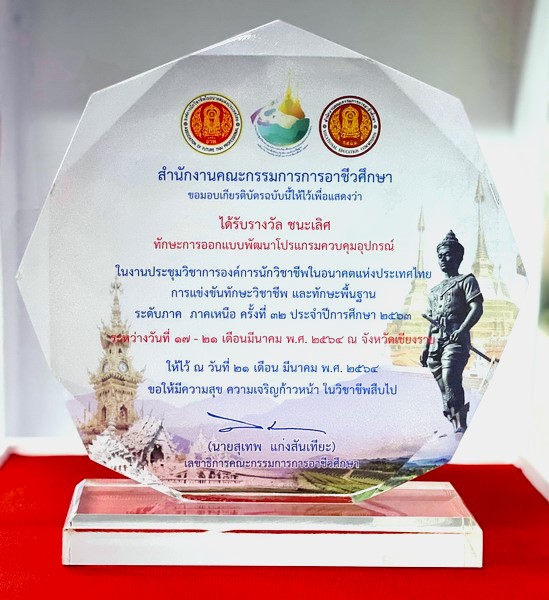 รางวัลชนะเลิศ เหรียญทอง ทักษะการออกแบบพัฒนาโปรแกรมควบคุมอุปกรณ์ ระดับภาค